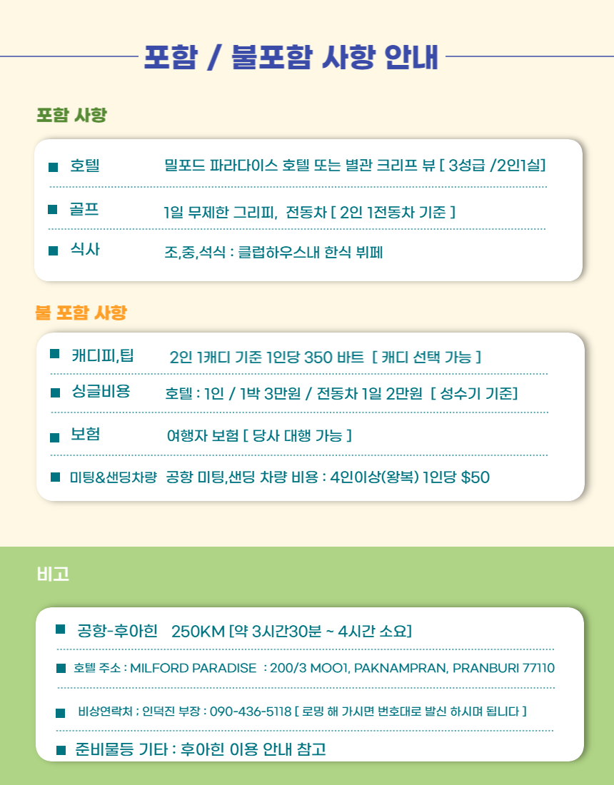 후아힌 코리아CC는 왕실의 휴양지로 유명한 후아힌에 위치하고 있으며 산과 바다가 조화롭게 공존하는 곳으로 복잡한 일상에서 벗어나 휴식과 골프를 동시에 즐길 수 있는 최적의 상품입니다.