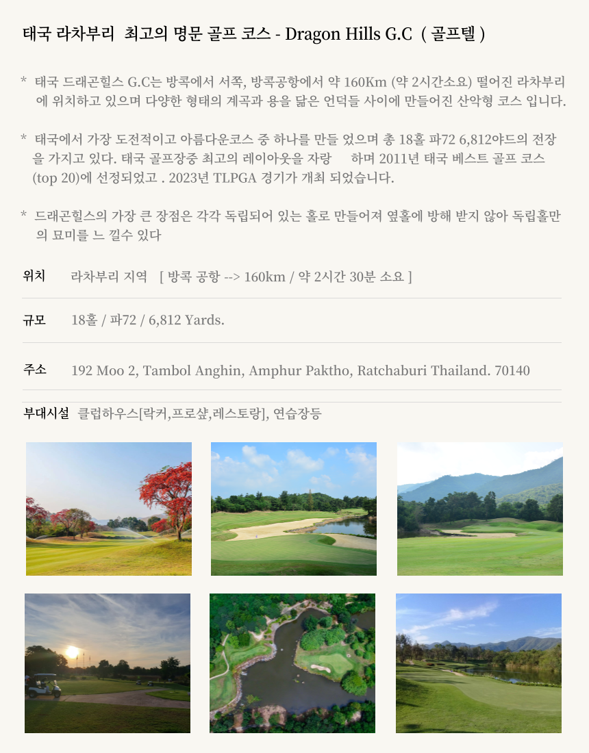 태국 드래곤힐스 CC는 방콕에서 서쪽, 방콕공항에서 약 160km 떨어진 라차부리에 위치하고 있으며 다양한 형태의 계곡과 용을 닮은 언덕들 사이에 만들어진 산악형 코스 입니다.