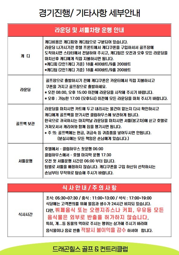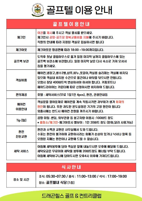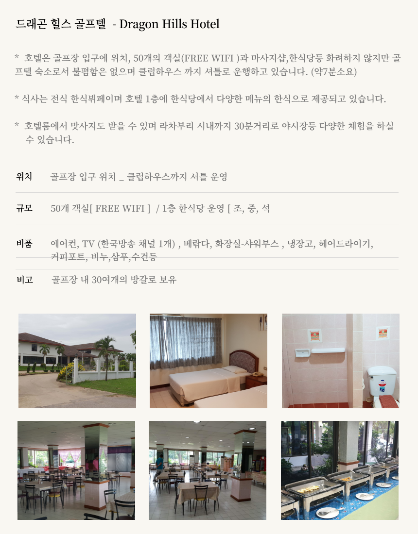 호텔은 골프장 입구에 위치해 있고 마사지샵과 한식당 등등 부대시설이 갖춰져 있으며 호텔에서 클럽하우스까지 셔틀도 운행하고 있어서 편히 이용할 수 있는 패키지 입니다.