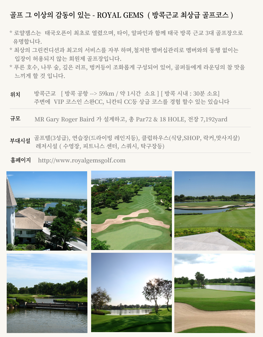 태국 방콕에 위치한 로얄잼스는 태국 왕족의 골프장으로 태국오픈이 최초로 열렸으며, 타이, 알파인과 함께 태국 방콕근교 3대 골프장으로 유명합니다