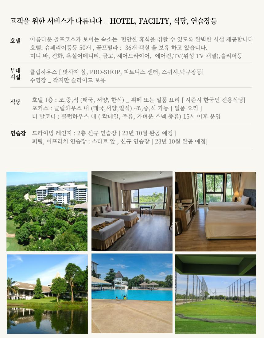 방콕근교 3대 명문 골프장으로 5개의 레스토랑과 바, 수영장 테니스장, 스쿼시장 등 다양한 스포츠 시설이 마련되어 있는 휴식과 골프를 즐기실 수 있는 고품격 리조트형 골프장 입니다.